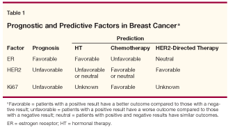 Indeed, a factor may be favorable for both prognosis and prediction (as in the ER example given above), or may be mixed. For example, HER2 is an unfavorable prognostic factor, but is a favorable predictive factor for response to HER2-directed therapies (Table 1). Until appropriate studies have been performed, however, it can be difficult to know how to use prognostic and predictive factors appropriately in the clinical setting. Prognostic and predictive properties based on currently available data for three common tumor markers are given in Table 1.