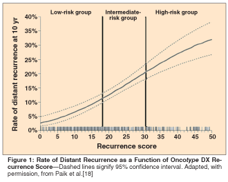 By correlating gene expression with clinical outcome, an algorithm was developed using a subset of 16 of the original 250 genes, as well as 5 housekeeping genes, to calculate a recurrence score, which correlated with risk of breast cancer recurrence (Figure 1). This algorithm was then validated in independent cohorts of tamoxifen-treated patients with ER-positive, node-negative breast cancer, including patients enrolled in the NSABP B-14 trial[18] and a cohort of patients treated in a community setting.[44]
