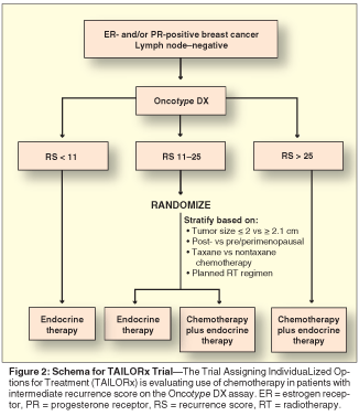• TAILORx-One study being conducted primarily in the United States is the Trial Assigning IndividuaLized Options for Treatment (TAILORx), which is prospectively evaluating treatment of patients with ER-positive, HER2-negative, lymph node–negative breast cancer whose tumors have intermediate recurrence scores on the Oncotype DX assay (Figure 2).[49] Tumor size must be between 1 and 5 cm, or between 0.5 and 1 cm if unfavorable histologic factors are also present. Patients with a low RS (≤ 10) will receive endocrine therapy, those with a high RS (> 25) will receive both chemotherapy and endocrine therapy, and those in between will be randomized to chemotherapy plus endocrine therapy vs endocrine therapy alone. The RS cutoff values were shifted downward because of the concern that patients at the upper end of the intermediate-risk group were likely to derive benefit from chemotherapy, and the investigators did not want to withhold chemotherapy from this cohort.