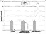 The results showed that the rate of complete pain relief ranged from 30% to 60% and was similar in both the placebo and Sr-89 groups [12]. Although adjuvant use of Sr-89 over local field radiation alone demonstrated a consistent trend of improved overall pain relief, this finding was not statistically significant. Important from the patient's point of view, Sr-89 treatment resulted in a significant reduction in the appearance of new painful metastases compared with radiotherapy alone (P less than 0.002, Figure 3). In terms of analgesia requirements, a greater proportion of patients receiving adjuvant Sr-89 reduced their analgesic intake by at least 50% or eliminated analgesic intake entirely (P less than 0.05) compared with the placebo group.