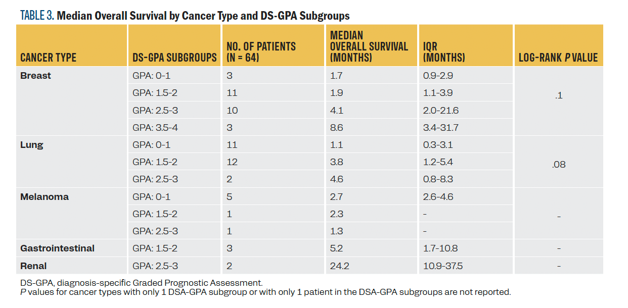 TABLE 3. Median Overall Survival by Cancer Type and DS-GPA Subgroups