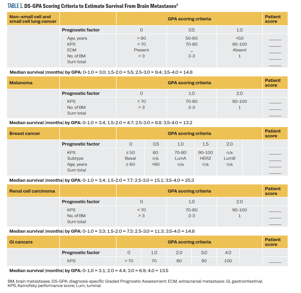specific GPA (DS-GPA) in 2012, a validated tool widely used to predict the median survival in brain metastases from lung cancer, breast cancer, melanoma, renal cell carcinoma, and gastrointestinal cancers. It utilizes a distinct combination of the validated prognostic factors: age, KPS, presence of extracranial metastasis, and number of brain metastases for each cancer type (Table 1).8 The DS-GPA tool helps clinicians estimate prognosis and make treatment decisions through a standardized patient-specific prognosis assessment in brain metastases.