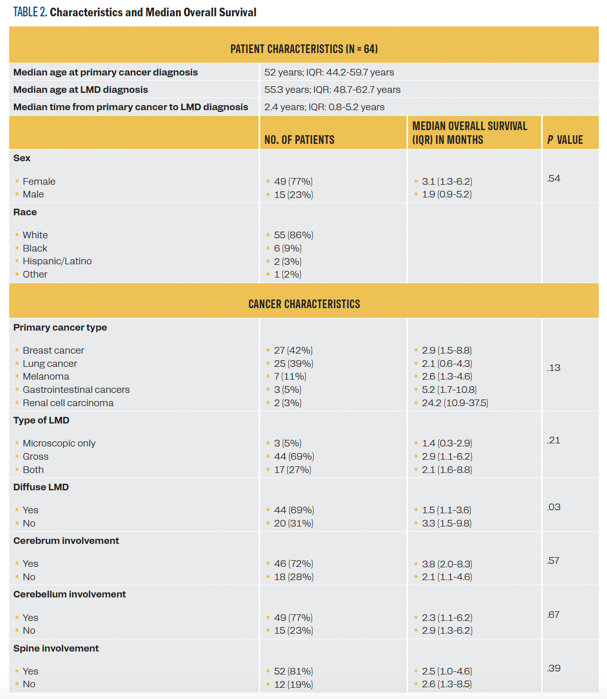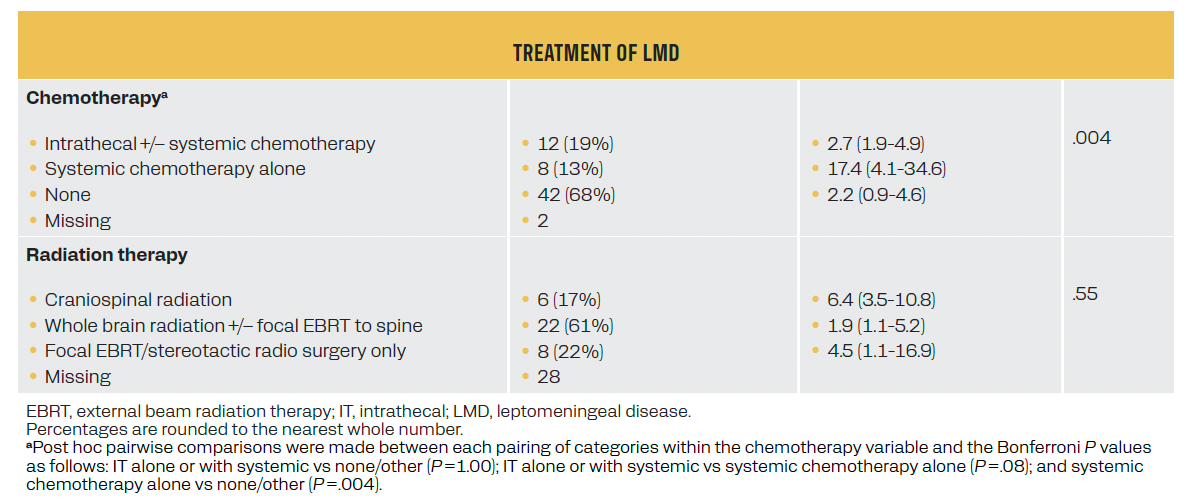 The median OS of all patients was 2.6 months from the time of LMD diagnosis, with no statistically significant differences in survival among primary cancer types. Historically, those with LMD from breast cancer have a better survival compared with those with other cancers. For instance, results from one retrospective study of 90 patients with LMD from 1975 to 1980 showed that 15% of patients with primary breast cancer were alive 1 year post treatment compared with 0% of those with lung cancer or melanoma.9 Similarly, results from another retrospective study of 155 patients with LMD from 1980 to 2002 showed the longest median OS of 11.3 months for breast cancer vs 4.7 months for melanoma,