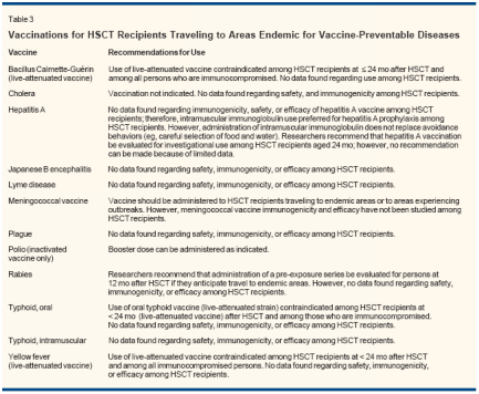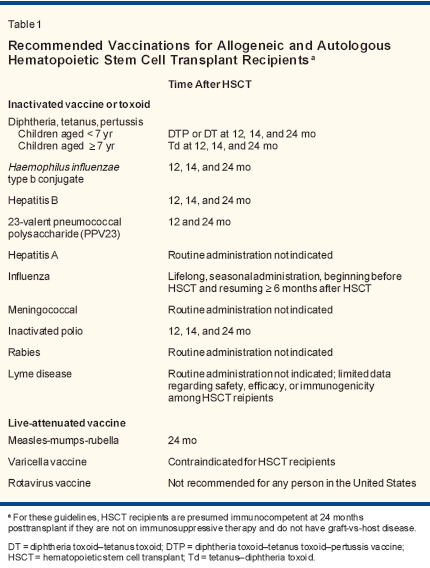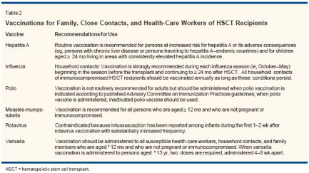 Recently, both the US Centers for Disease Control and Prevention (CDC)[2] and the European Group for Bone Marrow Transplantation[ 3,4] issued recommendations for infectious disease immunization of hematopoietic stem cell transplant recipients. As increasing numbers of transplant recipients survive and return to the community setting, it becomes incumbent upon primary care physicians to ensure appropriate vaccination both for the protection of transplant recipients and as a matter of community public health.