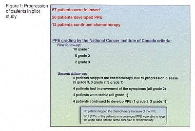 Twenty of the 67 patients developed PPE. Eight of the 20 patients with PPE stopped chemotherapy due to disease progression. The remaining 12 continued chemotherapy and were started on Bag Balm, massaged in 3 times daily after hands and feet were washed and thoroughly dried. Although four patients continued to develop PPE, four had improvement of symptoms, and four remained stable. All were able to continue chemotherapy at the same doses and schedule. No patients discontinued chemotherapy due to PPE (See Figure 1).