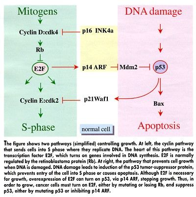 In a pathway dominated by growth factors (see Figure below), a failure to regulate the E2F protein can result in uncontrolled cell proliferation. "E2F basically controls entry into S phase of the cell cycle where cells commit to duplicating their DNA," he said. E2F activity is normally regulated by the retinoblastoma (Rb) protein.