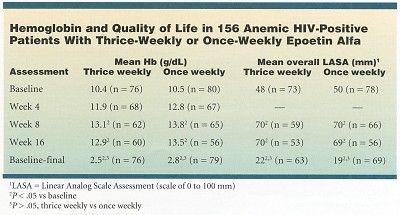 Findings from an interim analysis of 156 patients indicate that HIV-positive individuals receiving epoetin once a week achieve the same degree of improvement in hemoglobin levels and quality of life assessments as those who take the medication three times weekly.
