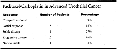 To evaluate the efficacy and safety of weekly paclitaxel/carboplatin in advanced carcinoma of the urothelium, investigators enrolled 33 patients from 17 sites.