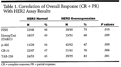 Investigators measured HER2 overexpression through a variety of assays (DAKO, p-Abl, CB-11, TAB-250, FISH).