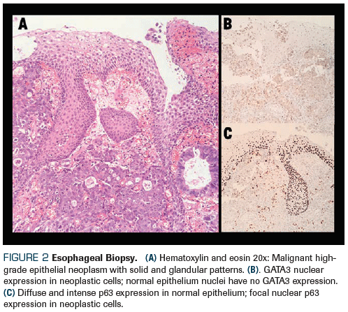 An upper gastrointestinal endoscopy was performed and revealed a complex ulcerated stenosis at 35 cm from the upper incisors. Biopsies were taken. The pathology examination revealed metastatic high-grade urothelial carcinoma: CK7-positive, CK20-negative, GATA3-positive, p63-positive, and uroplakin-positive (Figure 2). Morphologic appearance and immunohistochemistry were highly similar to that of the primary tumor and the previous systemic recurrence.