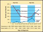 Lymph node metastases are most common at the extremes of age. They are found in 25% to 60% of both low- and high-risk patients, depending on the extent of the compartment dissection.[23,24] Children with papillary thyroid cancer present with even more extensive lymph-node metastases, ranging from 50% to 90% at the time of diagnosis.[25-28] Children nonetheless have a relatively favorable outcome after initial therapy, with disease-free survival rates of 80% at 5 years and 60% at 10 years, providing they are adequately treated with total thyroidectomy and 131I ablation.[25,26,29] Children and adolescents have a good prognosis with prolonged survival, even when extensive regional disease or lung metastases are present at the time of diagnosis, but very long-term follow-up is needed to appreciate the impact of the disease in children.[30,31] It is best to think of outcome in young patients in terms of normal life expectancy, which casts a different light on survival and recurrence rates.