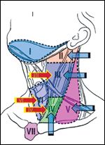 Ongoing controversy surrounds the optimal initial management of papillary lymph node metastases.[18,19] The neck is divided into seven contiguous lymph node compartments that are identified by roman numerals I to VII (Figure 4). Compartment VI creates the greatest concern for surgical complications and unsuspected lymph node metastases, which are found in 50% to 65% of patients.[20,21] Still, lymph node metastases occur nearly as often in the ipsilateral lateral cervical compartment levels III and IV, with fewer metastases in level II, while a small number skip past the usual path of metastasis and are found in contralateral compartments III and IV.[22]