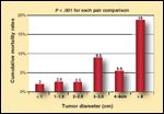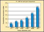 Recurrence rates were almost 6% at 5 years and 9% at 10 years, increasing significantly by 1 cm tumor increments (P < .001, Figure 2). The 10-year cancer-specific survival rates declined with increasing tumor size; however, survival was statistically worse only for patients with tumors larger than 4 cm (P < .0001, Figure 3). Multivariate analysis found that lobectomy was associated with a 57% higher risk of recurrence (P = .001) and a 21% higher risk of cancer death (P = .027) compared with total thyroidectomy.