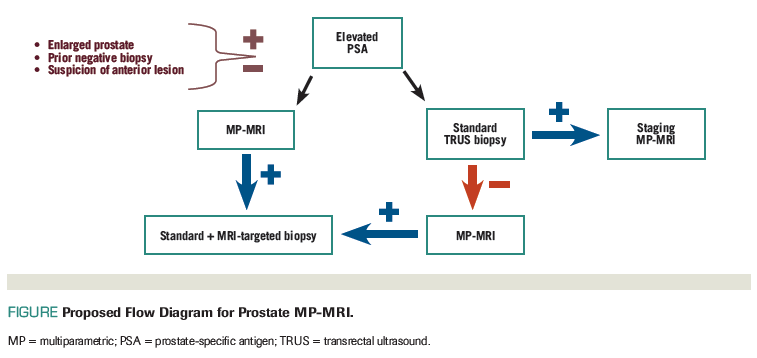 Detection of clinically significant cancer in a re-biopsy setting is up to 54%.[11] Sufficient evidence supports a targeted approach in the setting of elevated PSA levels following a negative TRUS biopsy. However, little evidence compares targeted approaches. The National Comprehensive Cancer Network and the American Urological Association recommend MRI and targeted biopsy after one prior negative biopsy.[11-13] The Figure shows a proposed flow diagram for the use of MP-MRI.