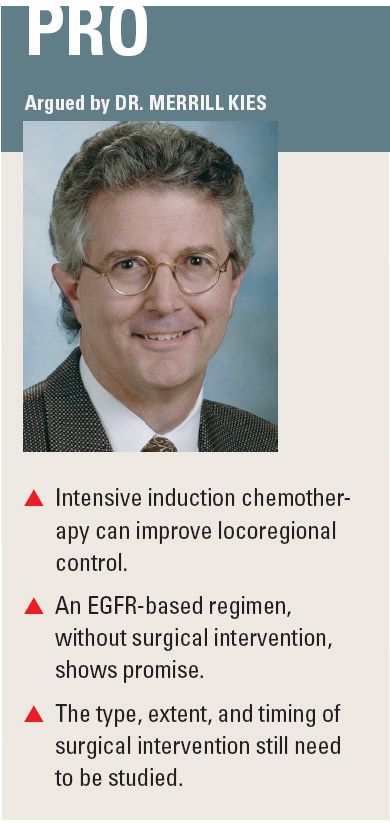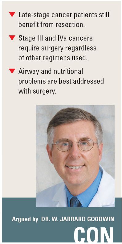 Merrill S. Kies, MD, argued the “pro” side of the issue-that surgery will not continue to be used as a matter of course in all head and neck cancer patients-focusing on the sophisticated chemotherapy and radiotherapy regimens now in use. Dr. Kies is professor of medicine and director of clinical programs, department of thoracic/head and neck medical oncology, at Houston’s M.D. Anderson Cancer Center.