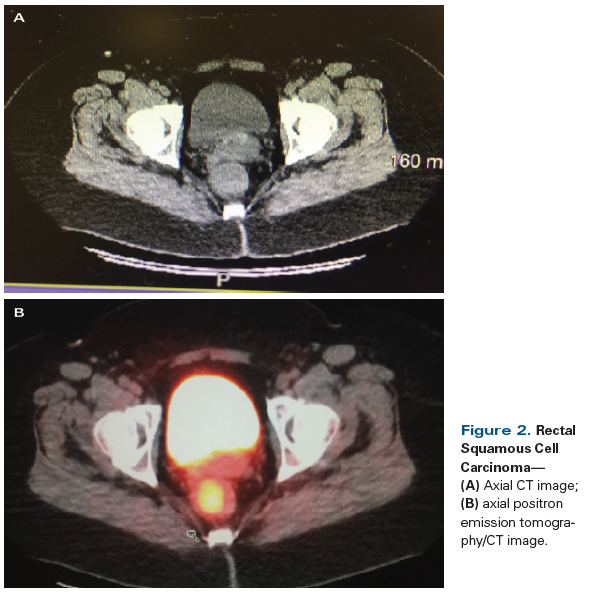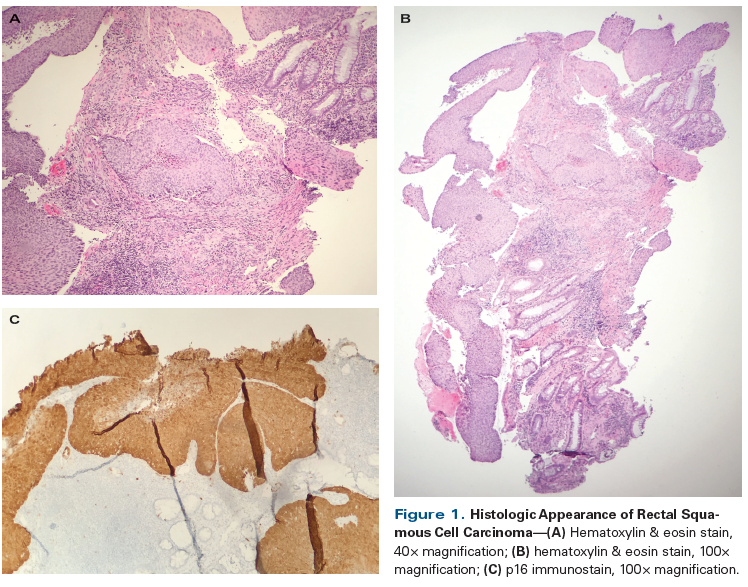 A 56-year-old Caucasian woman presented to her primary care physician with a 3-month history of intermittent bright red rectal blood with defecation. At her initial visit, a digital rectal examination, anoscopy, and a pelvic examination with DNA testing for high-risk human papillomavirus (HPV) were performed; all results were negative. She was referred for a colonoscopy, which revealed an abnormal area with a 3 × 4–cm mass in the rectum at a distance of 10 cm from the anal verge. Colonoscopic biopsy of this mass was consistent with invasive squamous cell carcinoma (Figures 1A and 1B); p16 immunohistochemistry staining of the biopsy specimen was positive (Figure 1C). Staging workup with a total body CT scan (Figure 2A) and positron emission tomography (PET)/CT scan (Figure 2B) confirmed the presence of a rectal mass, which demonstrated a standardized uptake value of 10. There was no evidence of nodal or distant metastasis. The patient was referred to medical oncology for further treatment recommendations.