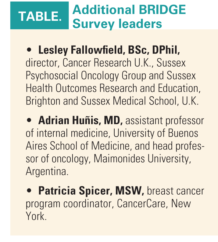 ABSTRACT: A global survey in nine countries reveals common ground among patients with advanced disease. Members of the BRIDGE survey steering committee explain how oncologists can use the data in their breast cancer treatment programs.