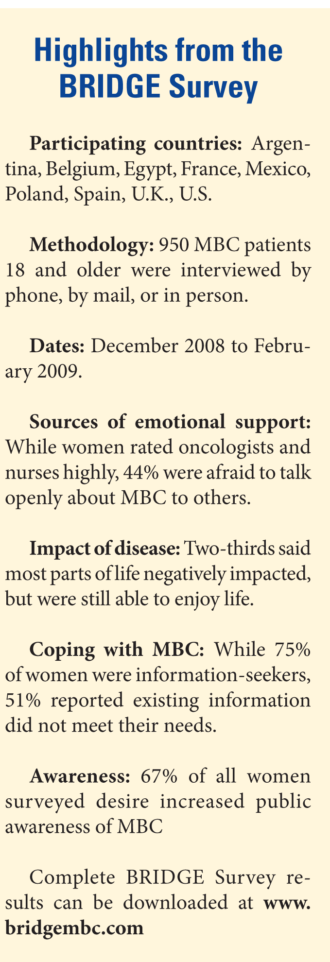 The BRIDGE Survey (Bridging Gaps, Expanding Outreach-Metastatic Breast Cancer Patient Survey) aimed to take those women off the sidelines and give them a voice. Sponsored by Pfizer Oncology, the survey collected data from 950 women with metastatic breast cancer (MBC) in nine countries (see Sidebar, below right).