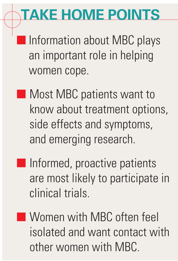 Dr. Oratz: One of the things that we learned is that women really do want access to clinical trials (see Sidebar, below). They understand that MBC is not curable, but there is also this understanding that a woman can live with MBC for many years with her symptoms well managed and without rapid progression of disease. They understand that treatment can be effective and that our best hope is to continue identifying new treatments. This came out in the survey from all women regardless of the number of clinical trials available to them.