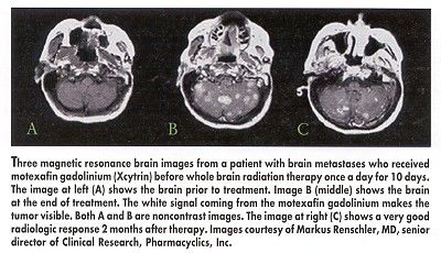 For the lead-in study, 25 patients received an injection of motexafin gadolinium followed by standard whole brain radiation therapy once a day for 10 days. They had an average of 12 brain metastases that had not previously been resected or irradiated from lung (52%), breast (24%), and other cancers.