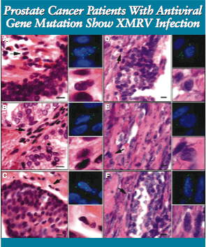 PAGE 1 A new retrovirus XMRV was detected in prostate tissue from these two prostate cancer cases (A-C & D-F) homozygous for an RNASEL mutation: FISH+ cells in green (top right enlargements); arrows in left panels (H&E stain) show FISH+ cells (bottom right enlargements).