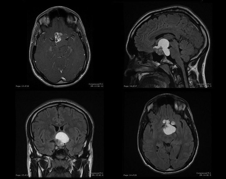 The T1-weighted post-contrast image (top left), and the T2-weighted images (top right, bottom left and right) are shown here.