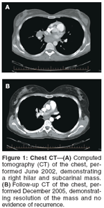 On posttreatment CT scan of the chest, the mass had decreased dramatically in size, measuring 1.5 cm in greatest dimension. On follow-up positron-emission tomography (PET)/CT scans, no focal abnormalities have been identified. She is now 5 years post–radical radiotherapy for her right hilar and subcarinal recurrence of her primary squamous cell carcinoma of the vagina. She continues to do well, without evidence of disease recurrence, having only mild reactive respiratory symptoms, which are stable. Her son is now 7 years old.