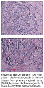 The clinical question remains: Does the subcarinal/hilar mass represent metastatic disease from the vaginal primary or perhaps a lung primary? Retrospectively, histologic and immunohistochemical evaluation and comparison of the three lesions-the subcarinal recurrence, pelvic obturator lymph nodes, and primary vaginal tumor-were independently performed by two pathologists. These physicians were in agreement that there was strong morphologic similarity between all three tissue samples.