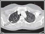 Pulmonary nodules seen on chest CT including 6-mm right upper lobe nodule (arrow). CT = computed tomography.