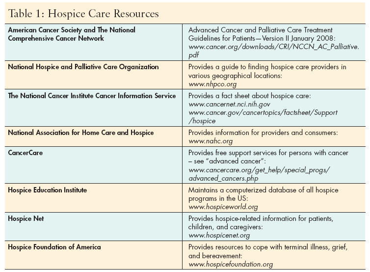 As Americans, we live in a death-denying society, surrounded by expansive, advanced technology and interventions that can extend and prolong life at all costs. We have made great strides in cancer care through early detection, prevention, and treatment, yet a significant number of patients still do not survive their disease. In 2008, for example, the American Cancer Society estimated 1,437,180 new cancer cases (all sites) and 565,650 deaths.[1] Most people who have survived cancer and completed their course of treatment live with the underlying fear and uncertainty that their cancers may return. While some people with advanced cancer are living longer and with improved quality of life, hospice care is a choice that provides a unique set of benefits, services, and support.[2]